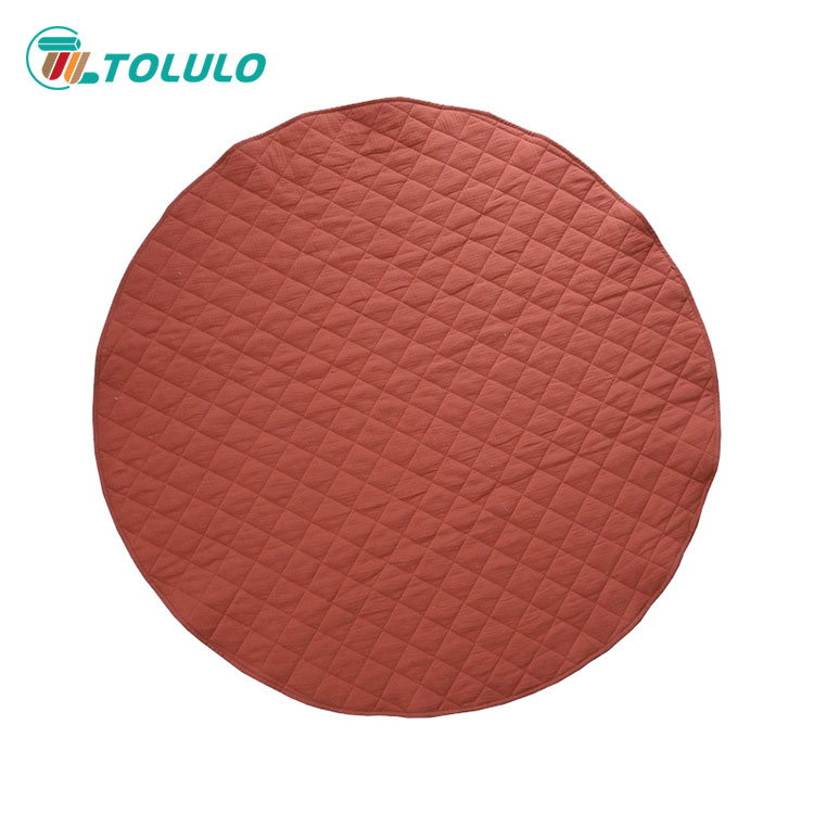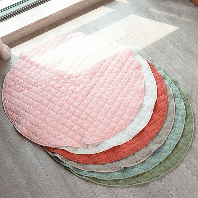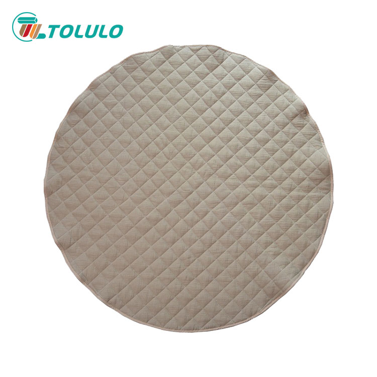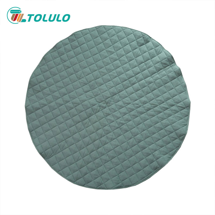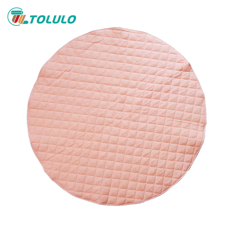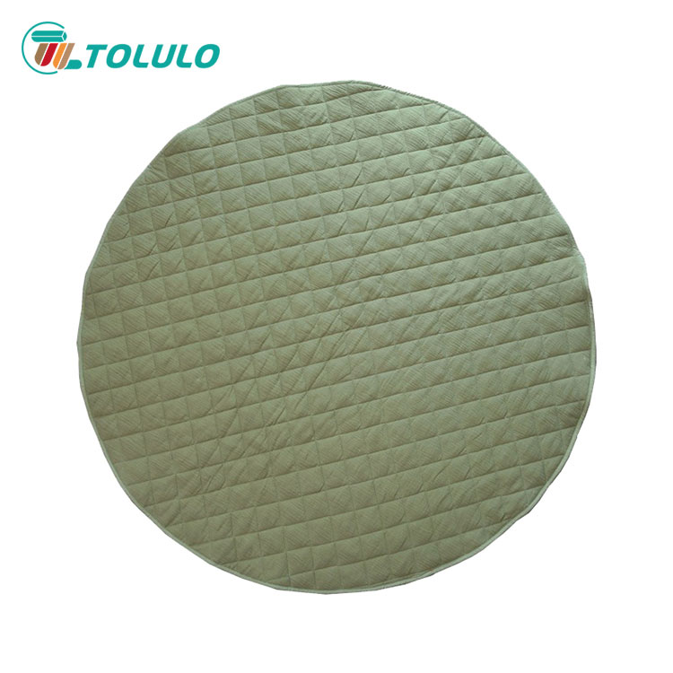 The appearance of the baby play mat that looks very soft is round. The surface material of the baby play mat is cotton cloth, which is environmentally friendly and skin friendly. The filler inside is spray adhesive cotton, and there are quilts in the middle to firmly lock each spray adhesive cotton. The baby play mat is rich in color and bright in color, which can meet the baby's visual experience. The baby play mat adopts high-quality printing and dyeing technology, with strong color fastness. You don't need to worry that the baby will make the socks colorful after walking around in white socks. Let the baby spend the playing time happily with the soft baby play mat every day. Baby play mat is suitable for living room, bedroom and baby play room. Babies can play with his favorite toys and have a happy day. Mother can also easily clean up the toys scattered on the mat. Once she lifts them, she can store the toys on the mat, which does not occupy space and is convenient and fast to save time.