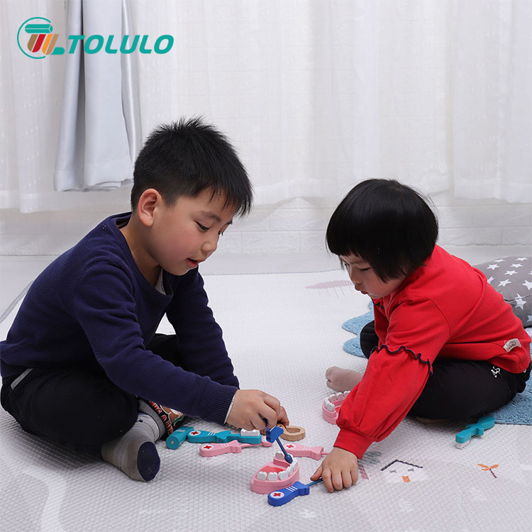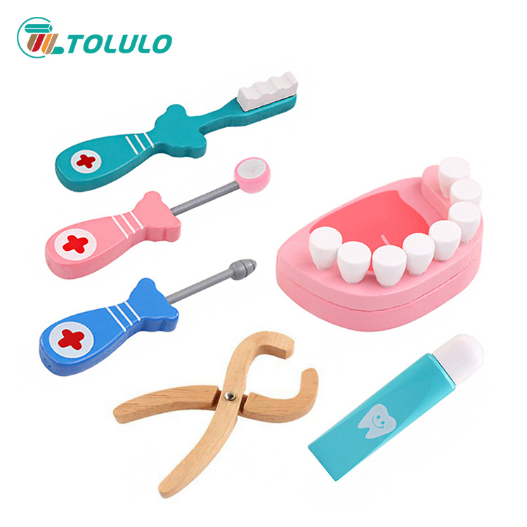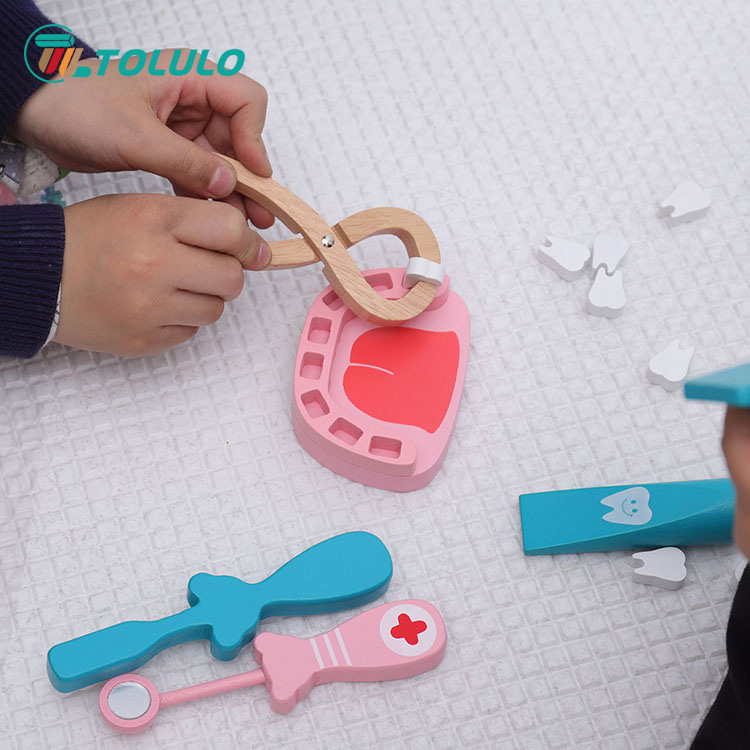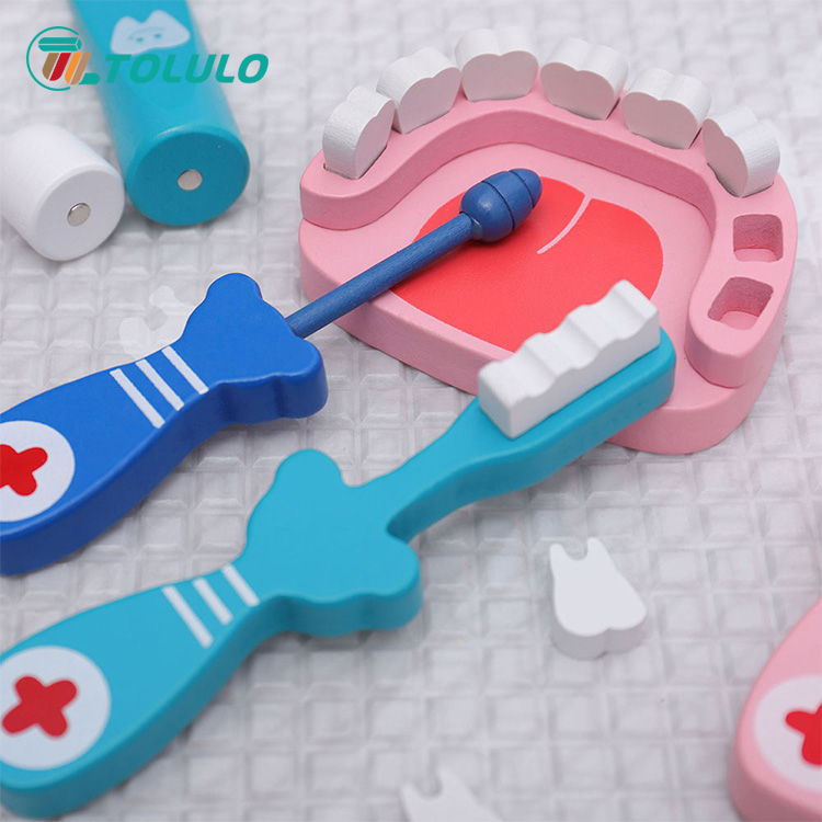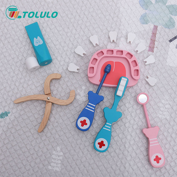 Doctor Kits Toys include 1 toothbrush ,1 oral mirror,1 probe teeth rods ,1 pliers,1toothpaste ,1 denture which has a colorful bag to store,also the color bag could do your designs.