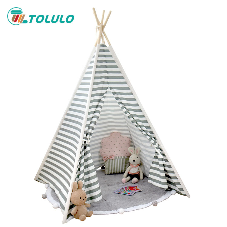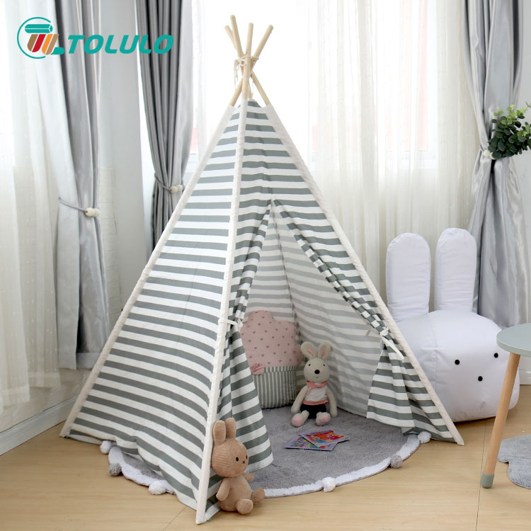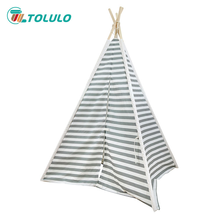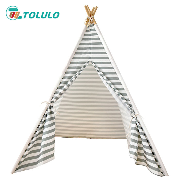100% Durable, natural, non-toxic and safe breathable cotton canvas and New Zealand pine material about the kids play tent. These handmade teepee play tents are made with the highest standards that ensures sturdy long term use. Kids play tent size: about 120 cm x 120 cm x 145 cm (height). This kids play tent is designed with gray water ripples, which is more decorative and interesting than a pure white teepee.